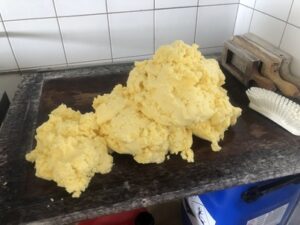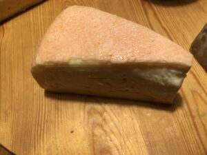 Links Schafskäse, rechts Kuhkäse, zwei nach demselben Rezept gemachte Alpkäse, deutlich sichtbar ist der Farbunterschied durch den natürlichen Carotingehalt der Kuhmilch.