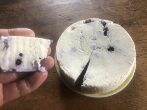 Heidelbeeren, die Beerenfrüchte des gleichnamigen Zwergstrauchs (Vaccinium myrtillus) sind keine übliche Zutat zum Käse. Einmal machte ich jedoch zum Eigenkonsum Frischkäse mit Heidelbeeren.