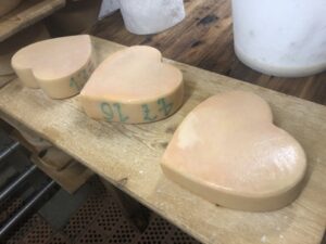 Gelegentlich findet man Käse (in der Regel Kuhkäse wie hier auf den Bildern, aber da gibt es keine Vorschrift) vom Typ des Mutschli nicht rund, sondern mit Herzform. Sie sind nicht häufig, aber die entsprechenden Käseformen sind im Fachhandel erhältlich. Beim Schmieren machen sie etwas mehr Arbeit als runde Mutschli. Die Nachfrage ist nicht so groß, man kauft sie mal als Gag oder zum Verschenken.