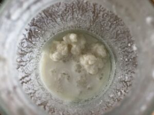 Kefir Zutaten > Kefir Ein Rest Ziegenkefir mit Knollen Kefir ist ein Sauermilchprodukt mit verschiedenen Bakterien und Hefen, die in Knollen vorliegen. Beim Käsen in kleinem, handwerklichen Stil nimmt man Kefir gelegentlich als Kultur.