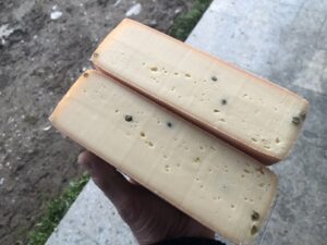 So gibt es in der Schweiz Pfeffermutschli. Auch den französischen Käse Buchette und den Schweizer Hopschilti gibt es mit Pfeffer. Teils ist der Pfeffer in ganzen Körnern im Laib verteilt wie bei den hier gezeigten Käsen, teils findet er sich nur auf der Oberfläche gemahlen wie beim Langenegger Pfefferkäse.