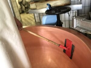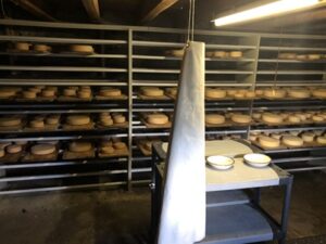 Sowohl in der Käserei als auch im Käsekeller trägt man eine Schürze (tunlichst nicht an beiden Orten dieselbe). Die ist sowohl für die Arbeitshygiene als auch zum Selbstschutz vor Nässe unverzichtbar.