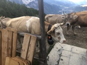 Auf einer Walliser Kuhalp: Kühe beim Austrieb, vorne links Käsebretter